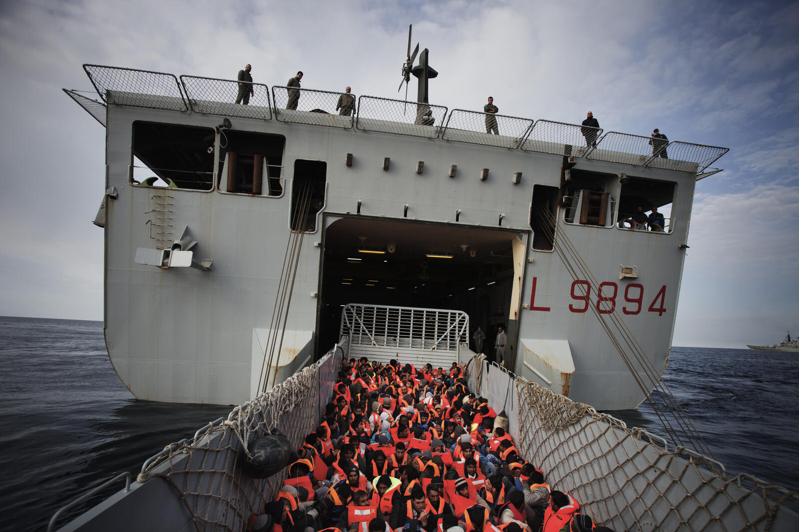 It takes a day for the San Giusto, an 8,200-ton troop carrier, to lumber from the waters off Lampedusa towards the Libyan coast. The ship is designed to accommodate up to 500 people. But once on mission they take on as many as 820 refugees in addition to their normal crew complement of 300. Resources are stretched, but there is no other choice. "We take on as many people as possible," says Mario Mattesi, captain of the San Giusto. "No one gets left behind."