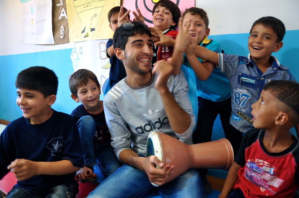"These are my people," he says, walking into a room of young Syrian refugees, all huddled in a circle, vibrating with energy even before Mostafa picks up his drum.