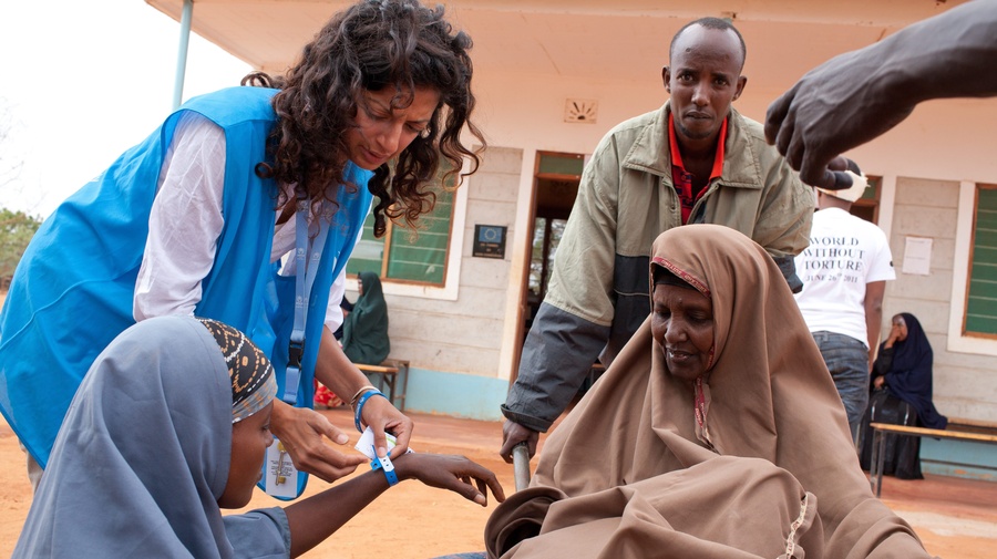 UNHCR staff help Somali refugees in Kenya. The ministerial meeting in Geneva will address the plight of the forcibly displaced, like these Somalis.