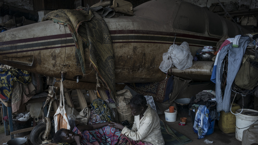 Displaced women find shelter from rain at the M'poko IDPs site close to the international airport in Bangui.