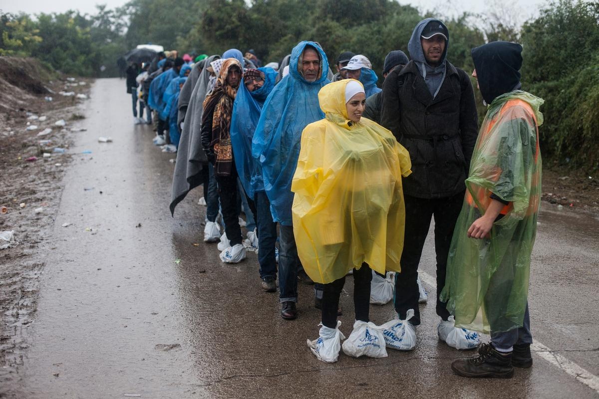 Refugees use a UNHCR tent to protect themselves from the rain as they arrive in Bapska, Croatia.