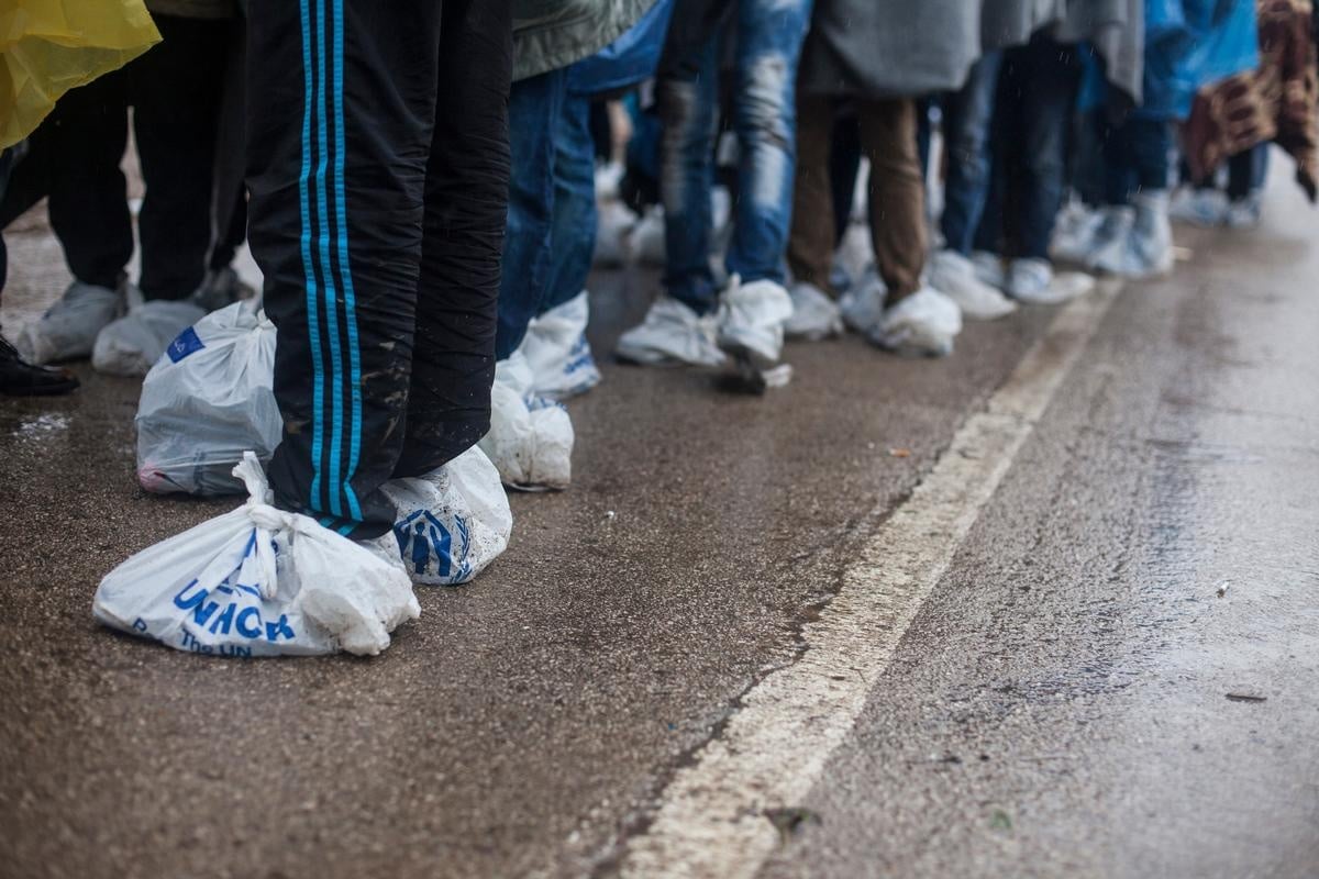 The gates open, and a new line of refugees squelches past, their shoes wrapped in UNHCR plastic bags, grabbing cups of tea from a contingent of Swiss by the roadside.