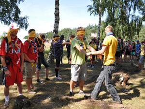 Activity leaders wind lines of hand-holding, blindfolded scouts between tree trunks and guy ropes as they try to cross the border at night. Scouts must then decipher forms in a nonsensical script and negotiate with temperamental and disinterested border officials to get all their family members, even the 'sick' and 'injured', through to under-resourced camps on the other side.