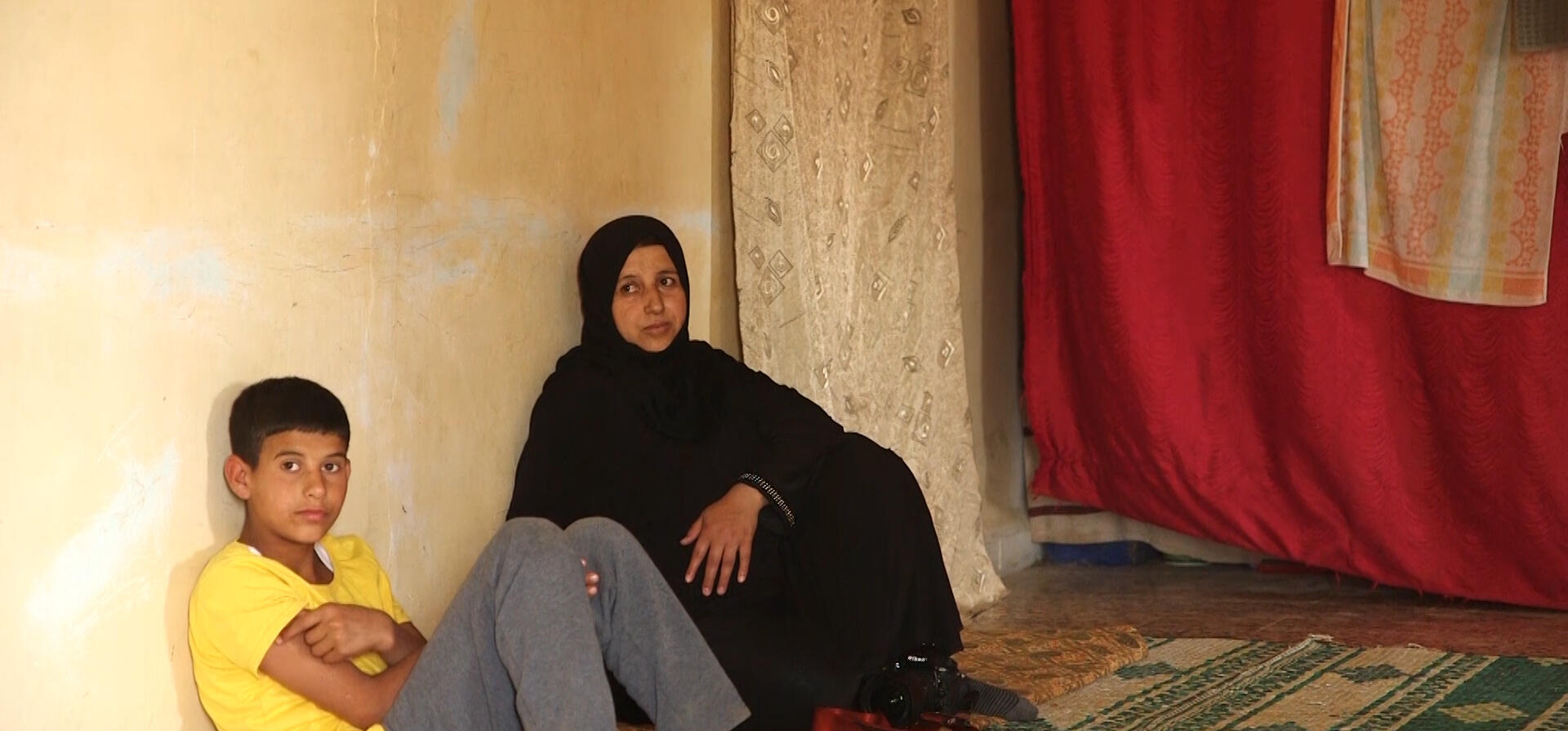 Nouhad indicates areas where rain leaks into their home through the flat roof above. During winter they rely on cash assistance from UNHCR to buy blankets and gas for heating to keep them warm.