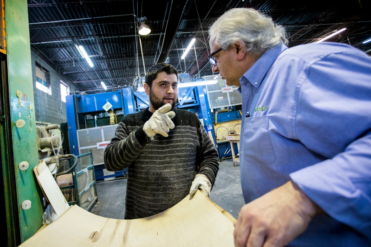 For that, Kevork has someone else to thank: Seatply’s owner, Levon Afeyan. In recent years, Afeyan – who is often greeted by his employees as “Monsieur Levon” as he walks the factory floor – has often hired newly arrived refugees. He now has 15 Syrians on the payroll. For them, learning French is the greatest challenge.
