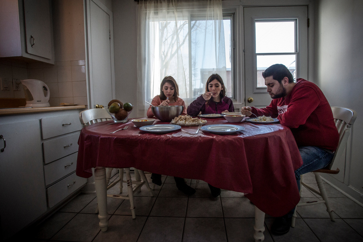 Less than four months later, he is already supporting himself and his twin sisters through his job at the factory, where he works an eight-hour shift each day. The family has an apartment, and his sisters, Lara and Houry, both 22, are studying French as they settle in.