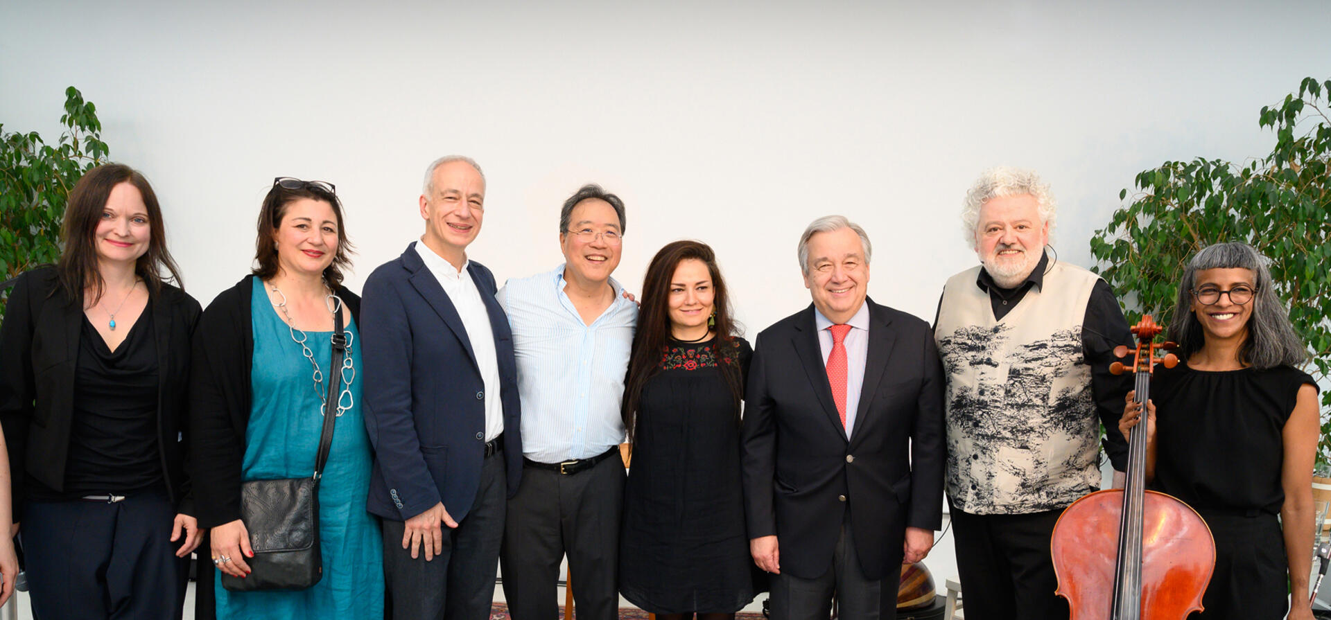 (From left to right) Artistic Director of ArtSocialSpace Brunnenpassage, Anne Wiederhold, Councillor for Culture, City of Vienna, Veronica Kaup-Hasler, President of Caritas Austria, Michael Landau, Cellist and UN Messenger for Peace Yo-Yo Ma, singer and workshop leader Basma Jabr, UN Secretary-General António Guterres, musician and workshop leader Marwan Abado and interpreter Sheri Avraham.