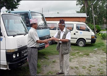 "It is really important for UNHCR to have harmonious relations with the local communities who have been so generously hosting the refugees for all these years," UNHCR's Representative in Nepal, Abraham Abraham, told local dignitaries in Damak last week as he handed over the keys of two garbage trucks the refugee agency was donating to the local community.