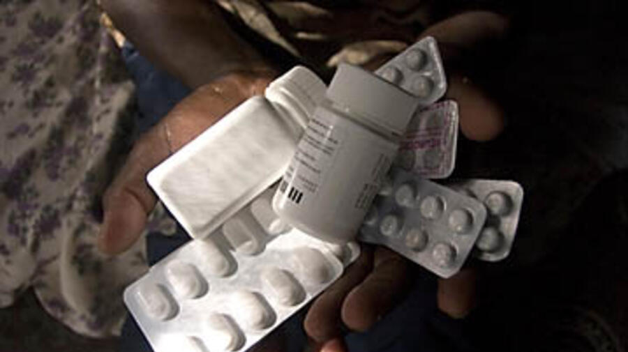 An HIV-positive woman holds out a variety of medicine. UNHCR and UNAIDS are urging host governments to ensure that refugees with HIV get the same treatment as their own citizens.