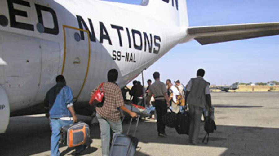 UNHCR staff board a UN plane that evacuated them from Chad to Cameroon on Monday.