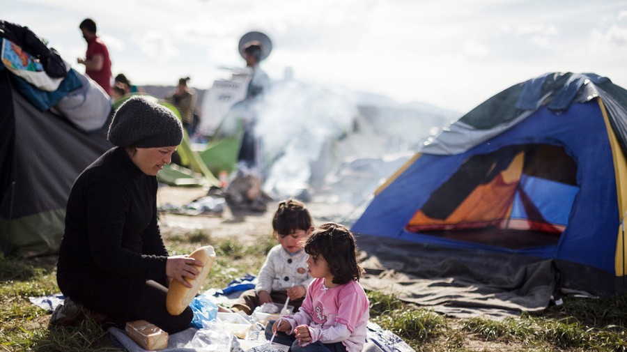 A mother feeds her two youngest children outside their tent in a makeshift camp near Idomeni.