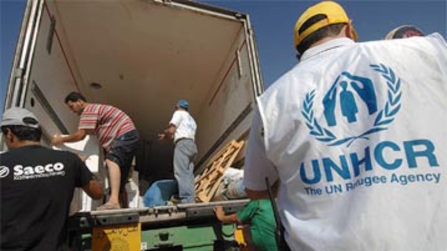 Workers unload a truckload of UNHCR aid at a camp near Iraq's border with Syria. The refugee agency has upped the budget for its Iraq-related programmes this year.