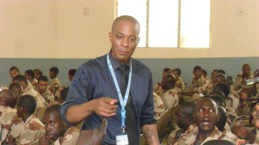 Protection Officer Pierre Jacques takes a question from one of the soldiers taking part in the human rights training at the Koulikoro military base.