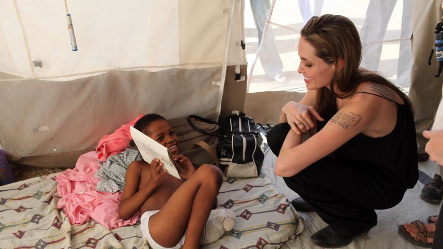 UNHCR Goodwill Ambassador Angelina Jolie talks to a 10-year-old Haitian boy who lost a limb during the January 12 earthquake in Haiti.