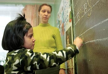 A young asylum seeker attending public school near an accommodation centre in the Moscow region.