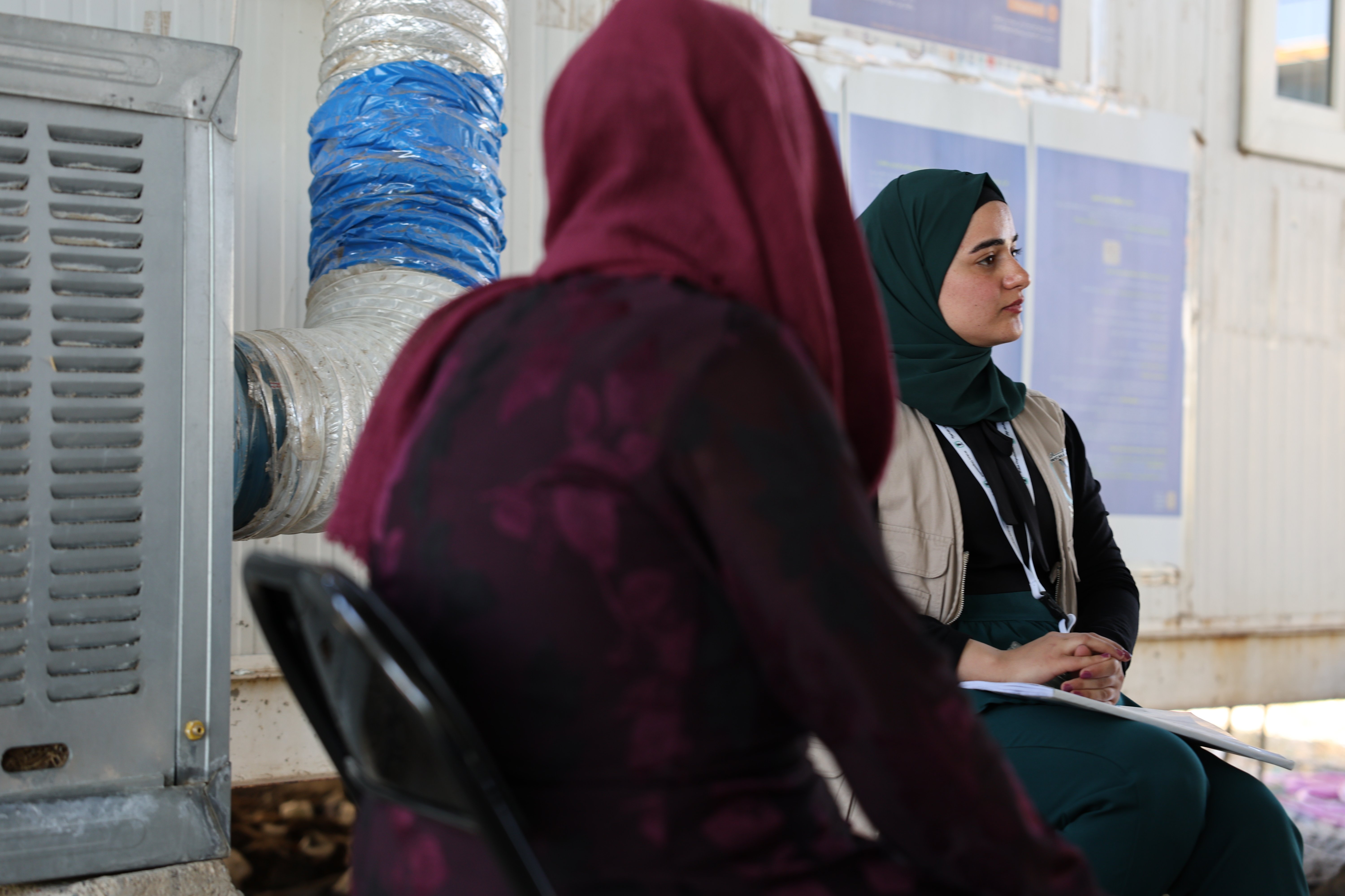 تقدم نرمين تمرينًا لإدارة الضغط النفسي لفوزية خلال جلسة فردية. © المفوضية السامية للأمم المتحدة لشؤون اللاجئين/ حمزة المومني