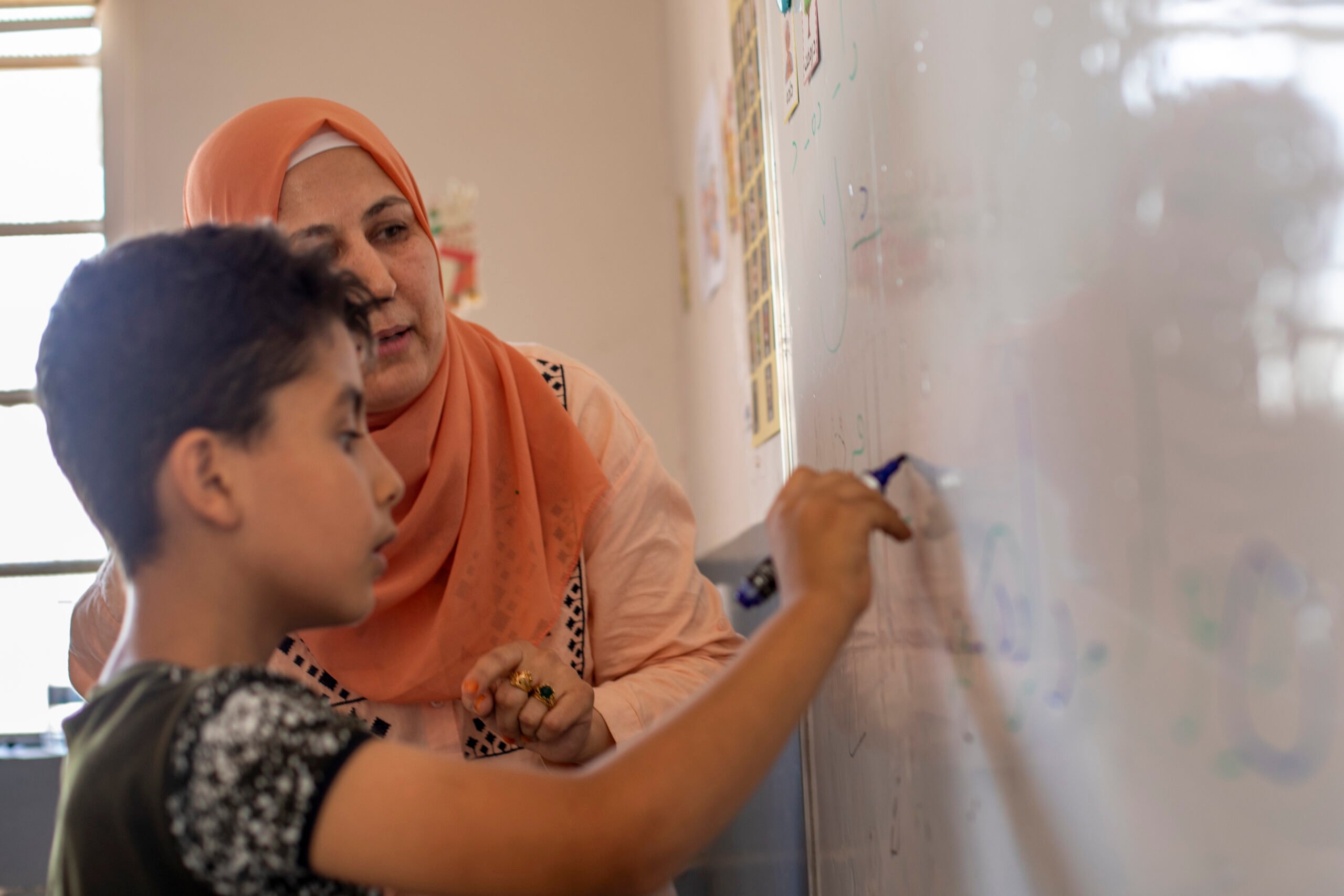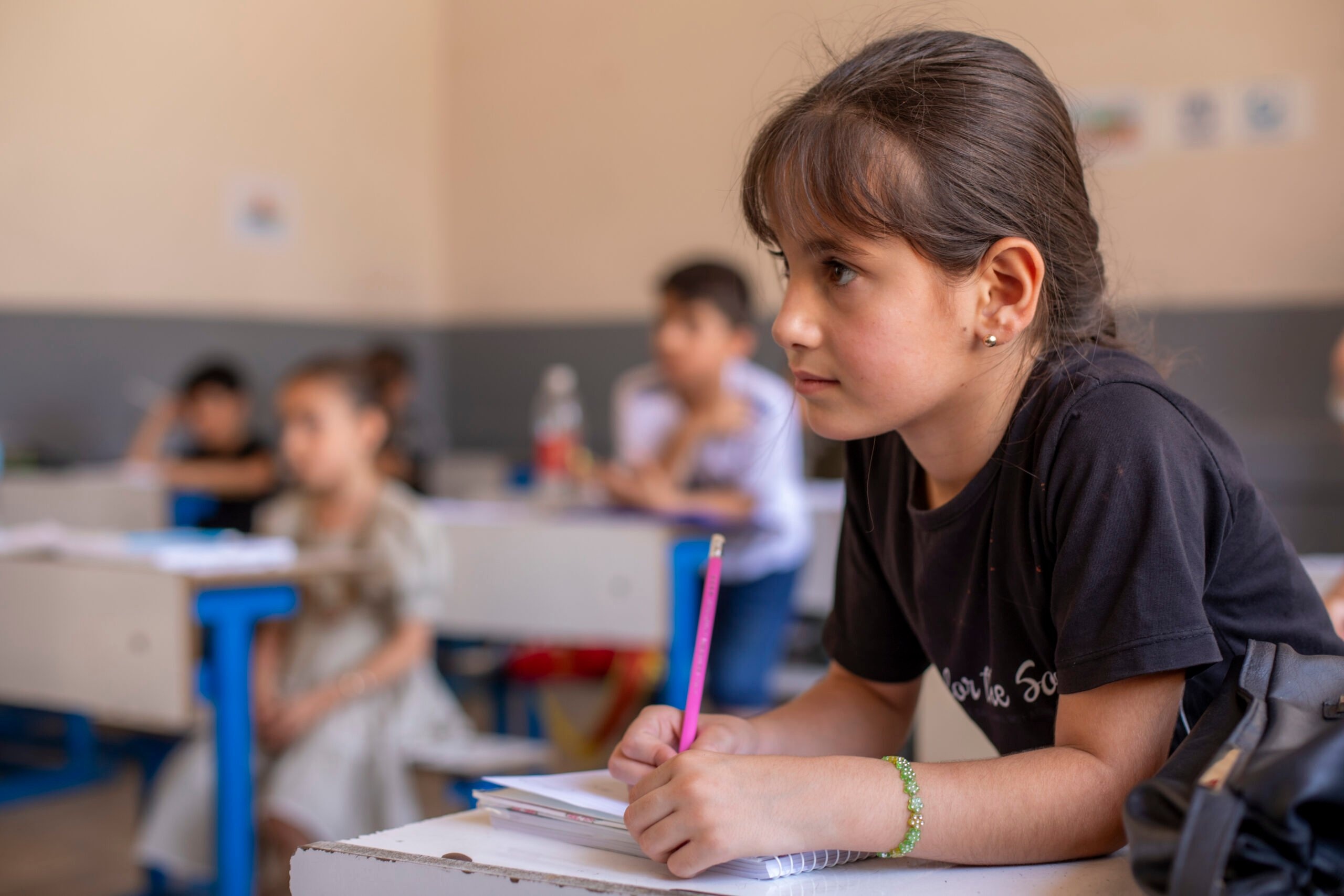 دالیا وانە بە قوتابیانی خۆجێی و پەنابەر دەڵێتەوە لە قوتابخانەیەکی گشتی لە سلێمانی. کۆمسیاری باڵای نەتەوە یەکگرتووەکان بۆ کاروباری پەنابەران / رەشید حوسەین رەشید