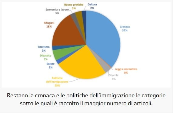 Le categorie più trattate corrispondono a quelle che hanno risentito maggiormente della riduzione: di rifugiati si è parlato nel 55% in meno dei casi; le politiche dell’immigrazione e il dibattito politico sono state ridotte rispettivamente del 40% e dell’82%. In media col dato generale le notizie di cronaca, diminuite del 33%.Il decremento appare generalizzato, con un calo che ha interessato 8 delle 11 categorie tematicheconsiderate. Gli unici argomenti più trattati rispetto all’anno precedente sono la cultura e la salute, i quali restano tuttavia estremamente marginali nella copertura complessiva (costituiscono insieme il 4% degli articoli).