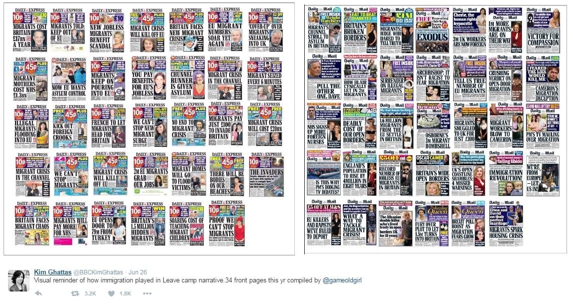 Basta poco per avere un’idea del ruolo che la cosiddetta “crisi dei rifugiati” ha giocato nelle sorti del referendum sulla Brexit. È sufficiente la raccolta di prime pagine di quotidiani inglesi realizzata da Kim Ghattas, reporter della Bbc. ">Un tweet fotografa il frame attraverso cui buona parte della stampa anglosassone ha alimentato il clima infuocato che poi ha condotto al risultato del 23 giugno.
