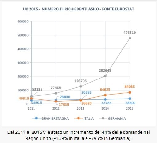 Nel primo trimestre 2016, le richieste d’asilo presentate nel Regno Unito sono state poco più di 10150 una cifra che proiettata sui 12 mesi da come risultato a un numero analogo a quello del 2015. Nello stesso trimestre le unità britanniche per l’esame delle domande d’asilo hanno preso 8155 decisioni di cui 66% sono stati dinieghi e 29% di approvazione per lo status di rifugiato. Nello stesso periodo in Italia sono state valutate 23145 domande con un analogo tasso di riconoscimento di protezione internazionale: 34%.