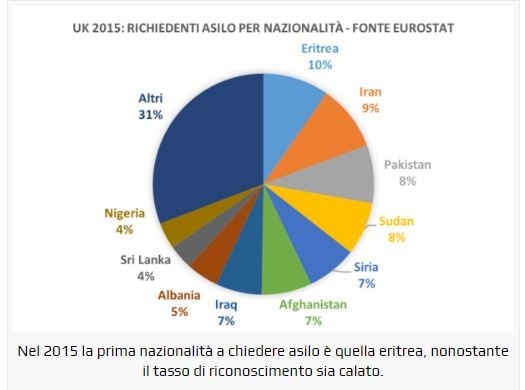 Quali sono le nazionalità che arrivano a fare richiesta d’asilo oltremanica? In cima alla lista nel 2015 ci sono ancora gli eritrei, malgrado il tasso di riconoscimento in UK sia crollato. A seguire Iran, Pakistan, Sudan e meno di 3000 dalla Siria.