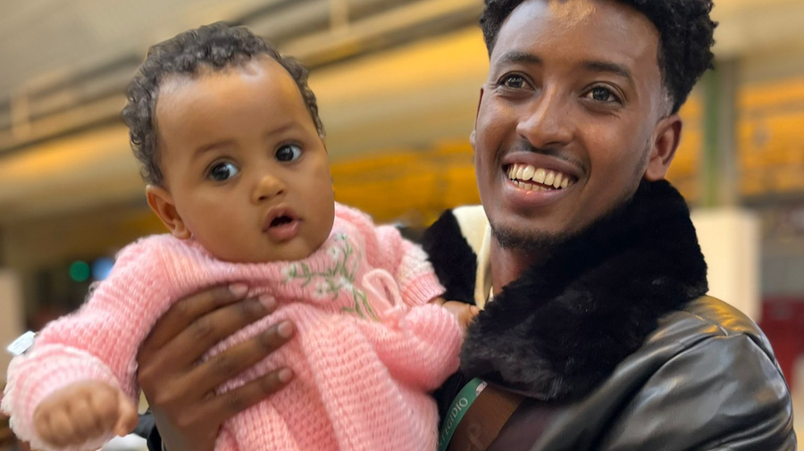 Un papà e la sua bambina appena arrivata all’aeroporto di Fiumicino con un volo di evacuazione dalla Libia che ha condotto in salvo 139 persone. © UNHCR/Barbara Molinario