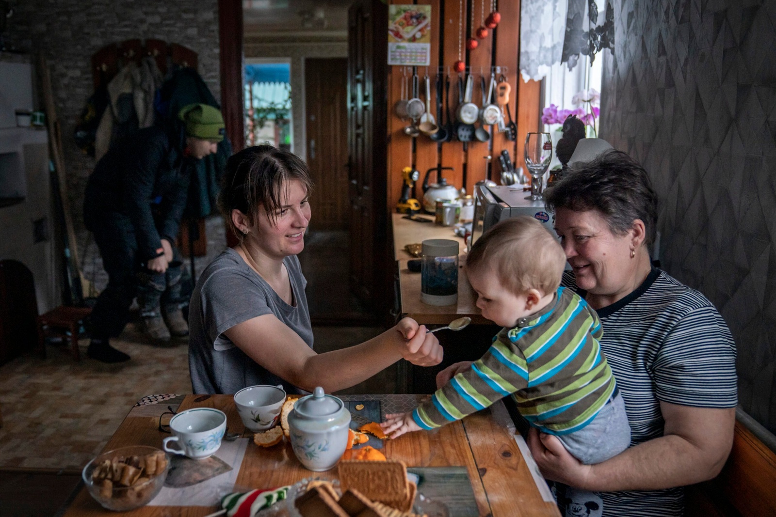Con Svitlana e la sua famiglia rimaste senza casa, quattro generazioni della famiglia Humennyy vivono ora nella casa di Kateryna: il più giovane, Matvii, pronipote di Kateryna e figlio di Svitlana, è nato poche settimane dopo la distruzione della casa dei suoi genitori.