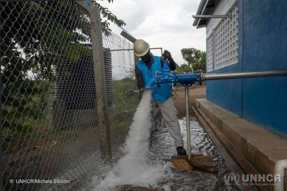 Un pozzo di trivellazione ad energia solare realizzato dall'UNHCR con investimenti da parte di partner e del settore privato pompa l'acqua di falda in punti più vicini a quasi 500 famiglie.