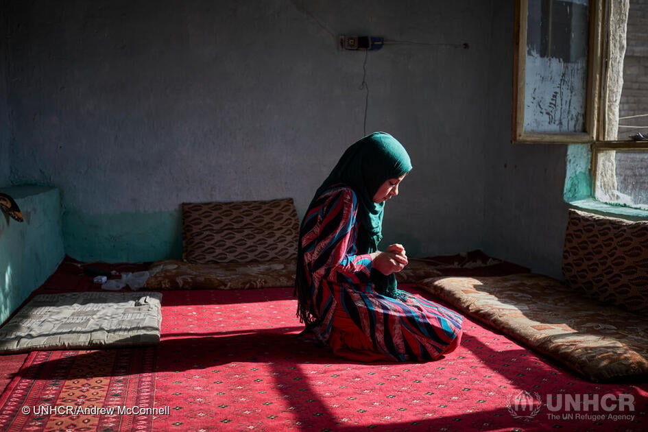 Mullah Ahmed e alcuni dei suoi figli siedono vicino alla stufa nel loro alloggio temporaneo a Kabul. © UNHCR/Andrew McConnell