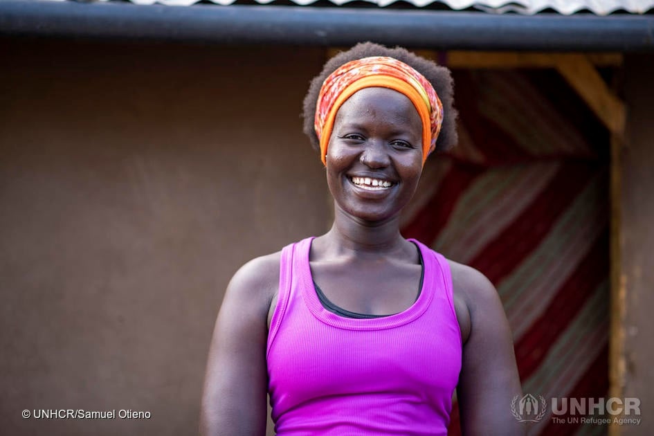 Rita Brown, rifugiata ugandese e istruttrice di yoga, si mette in posa nel suo campo di Kakuma, in Kenya. © UNHCR/Samuel Otieno