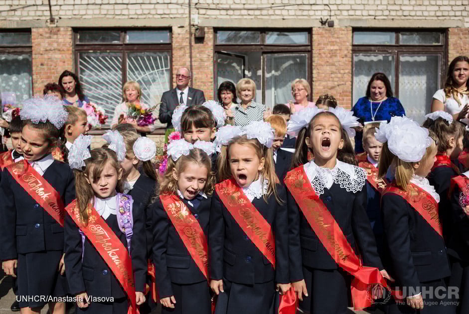 Durante il suo primo giorno nella nuova scuola, Lera indossava orgogliosa un grosso fiocco in testa, come da tradizione, con lo zaino blu di UNICEF sulle spalle e penne e matite che UNHCR ha distribuito nella regione.