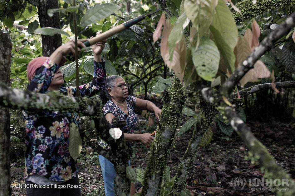 Vicenta González, 74 anni, controlla l'essiccazione dei semi di cacao in una struttura costruita a tale scopo nella sua fattoria nel nord della Costa Rica. © UNHCR/Nicolo Filippo Rosso