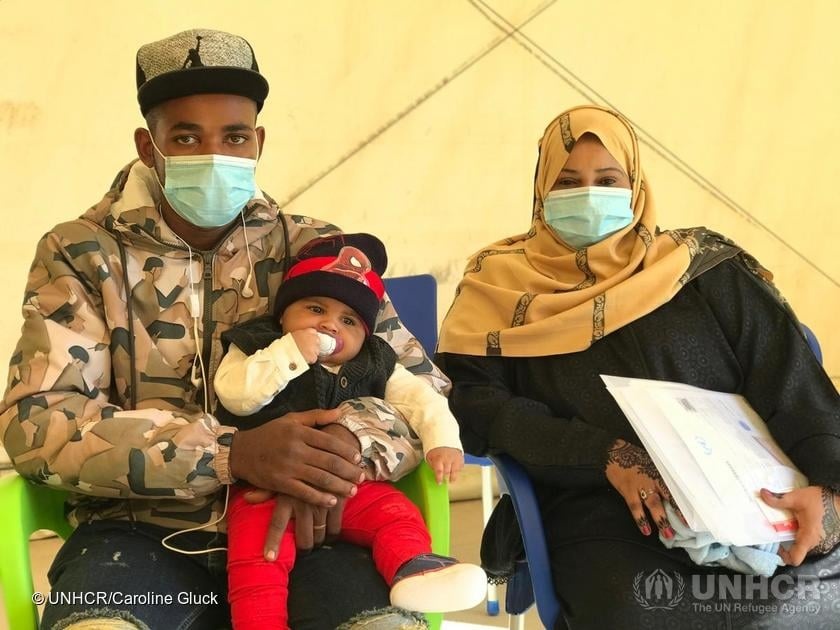 Il richiedente asilo somalo Fawaz, 21 anni, si prepara a prendere un volo di evacuazione umanitaria dalla Libia verso il Ruanda, con la sua compagna Farah, 24 anni, e il figlio di quattro mesi, Adnan. © UNHCR/Caroline Gluck