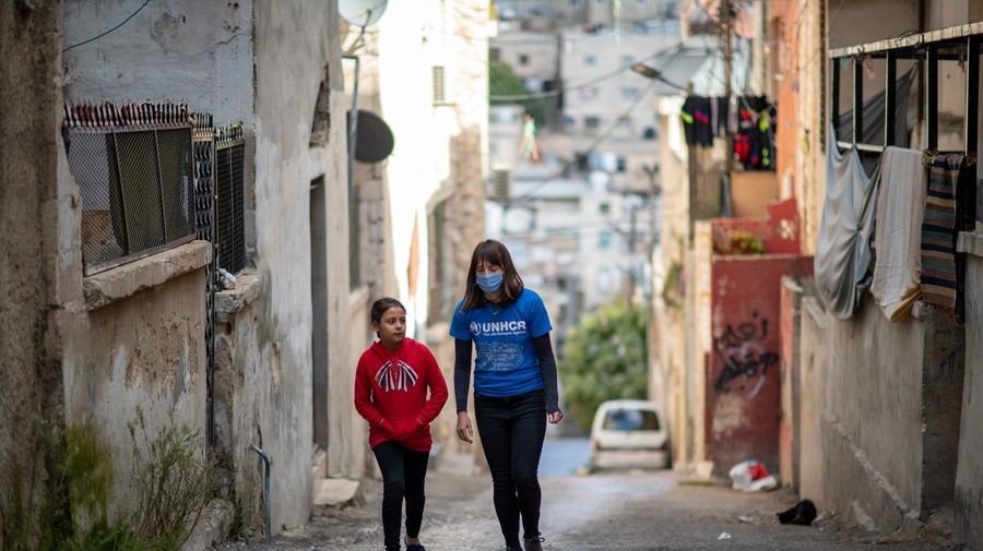 نغم، 9 سنوات، تمشي في الشارع خارج منزلها في شرق عمّان مع موظفة المفوضية في الأردن، ليلي كارلايل.