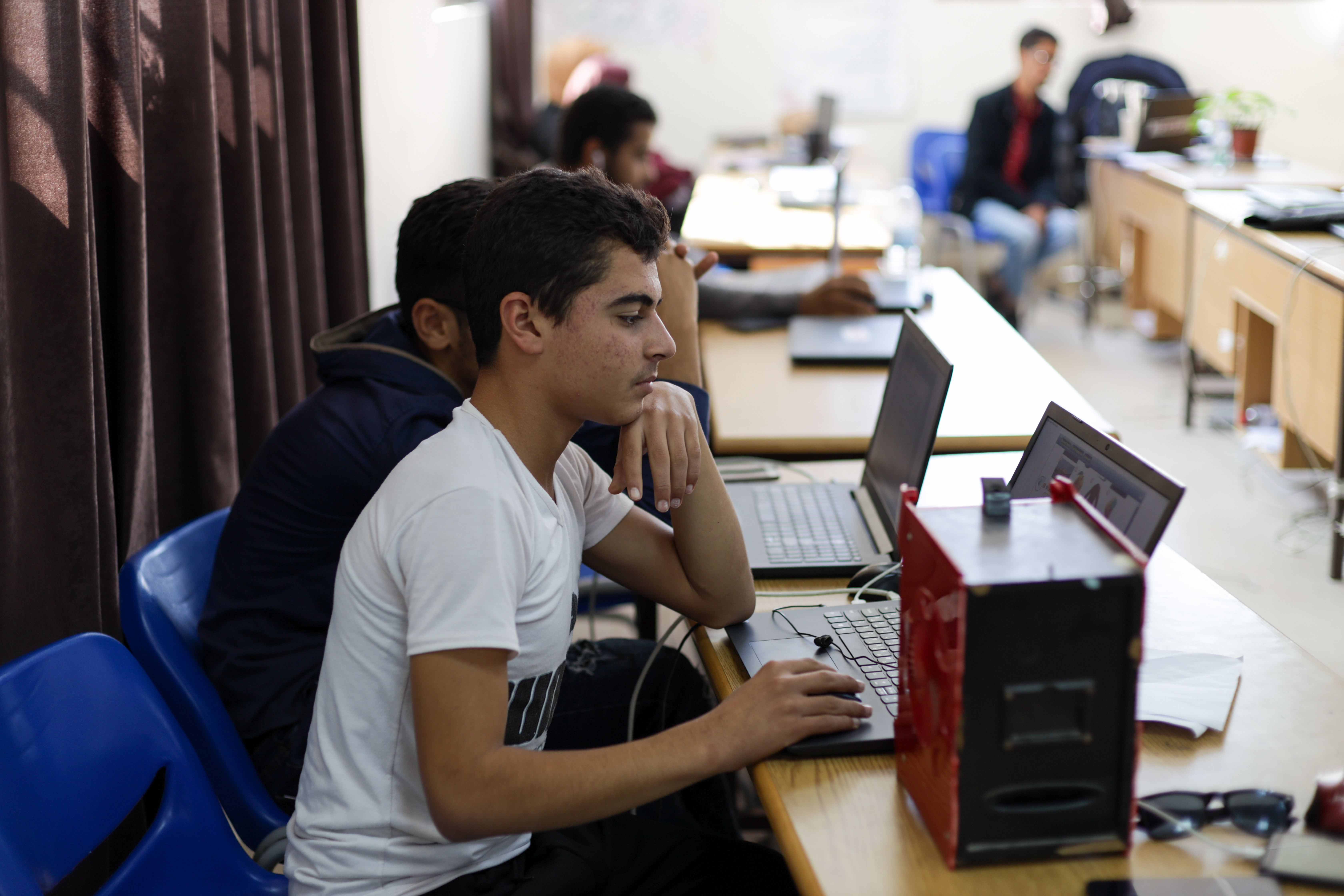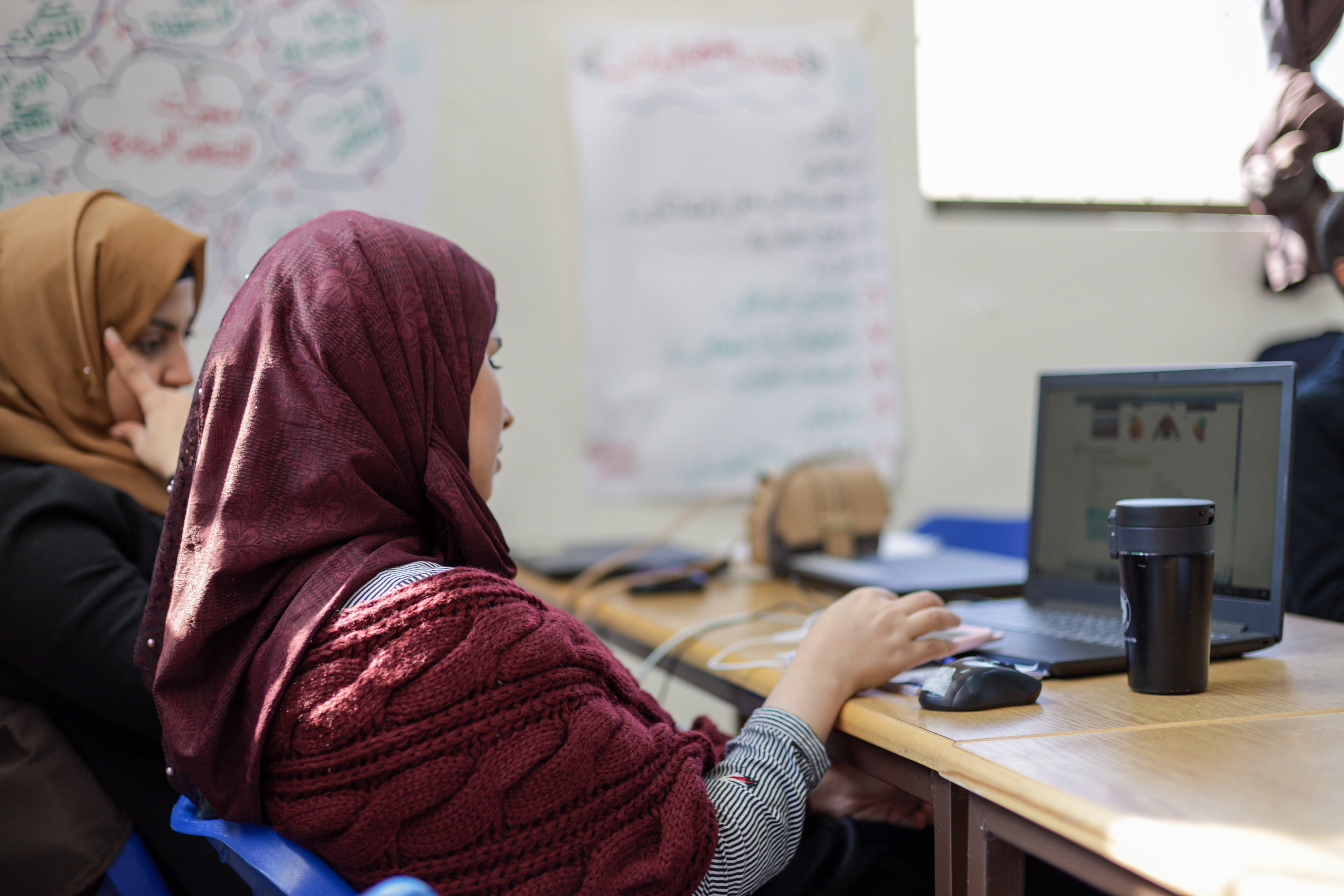 Refugee and Jordanian students gather in a classroom to learn coding skills in Northern Jordan © UNHCR Jordan