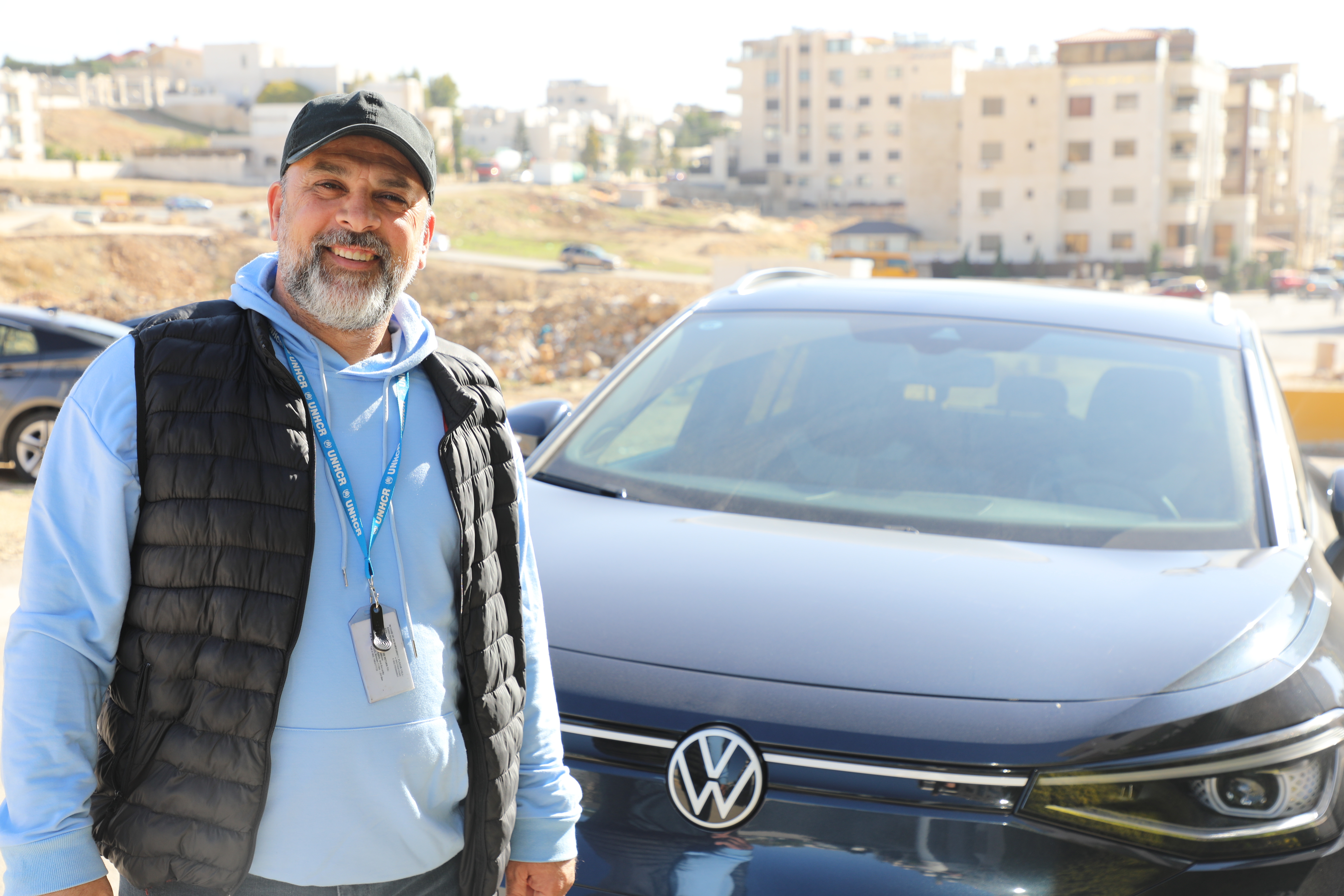 Shady Elian, UNHCR Driver, does not need fuel to move around in his car after he switched to an e-vehicle car two years ago, demonstrating his dedication to sustainable transportation.