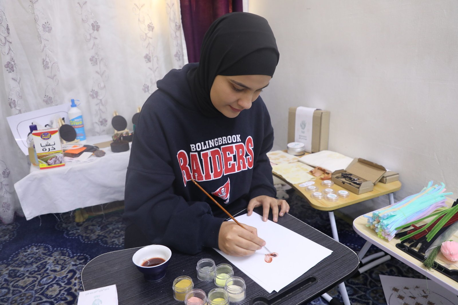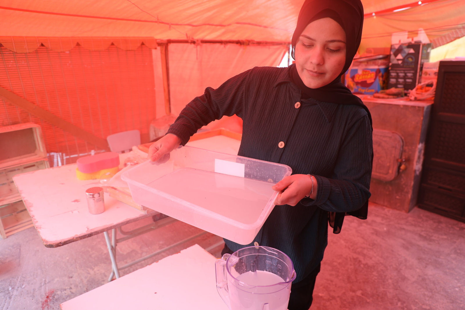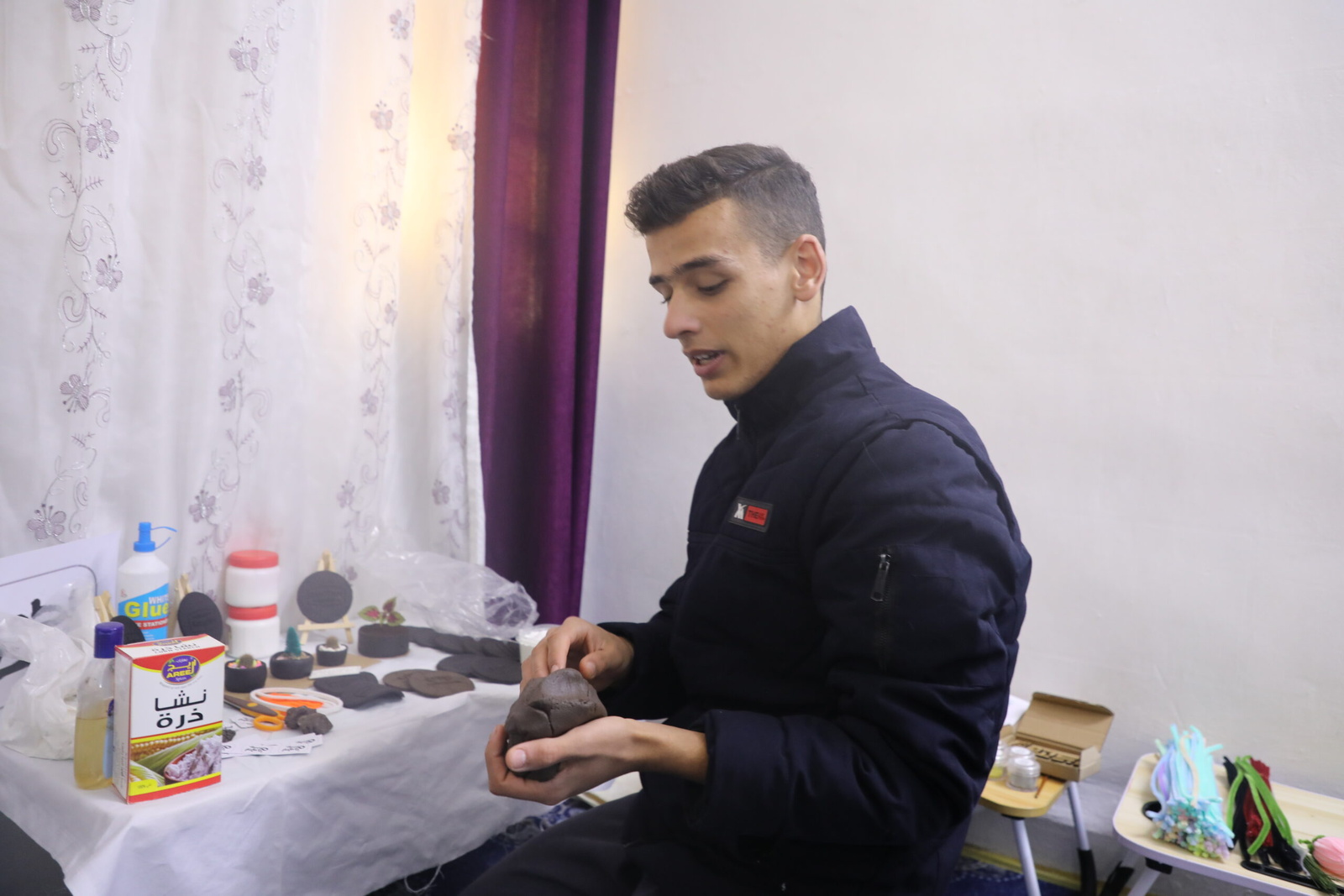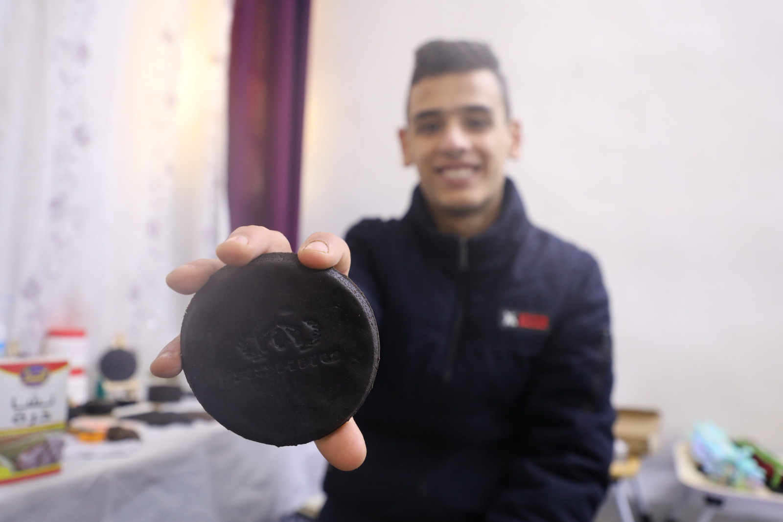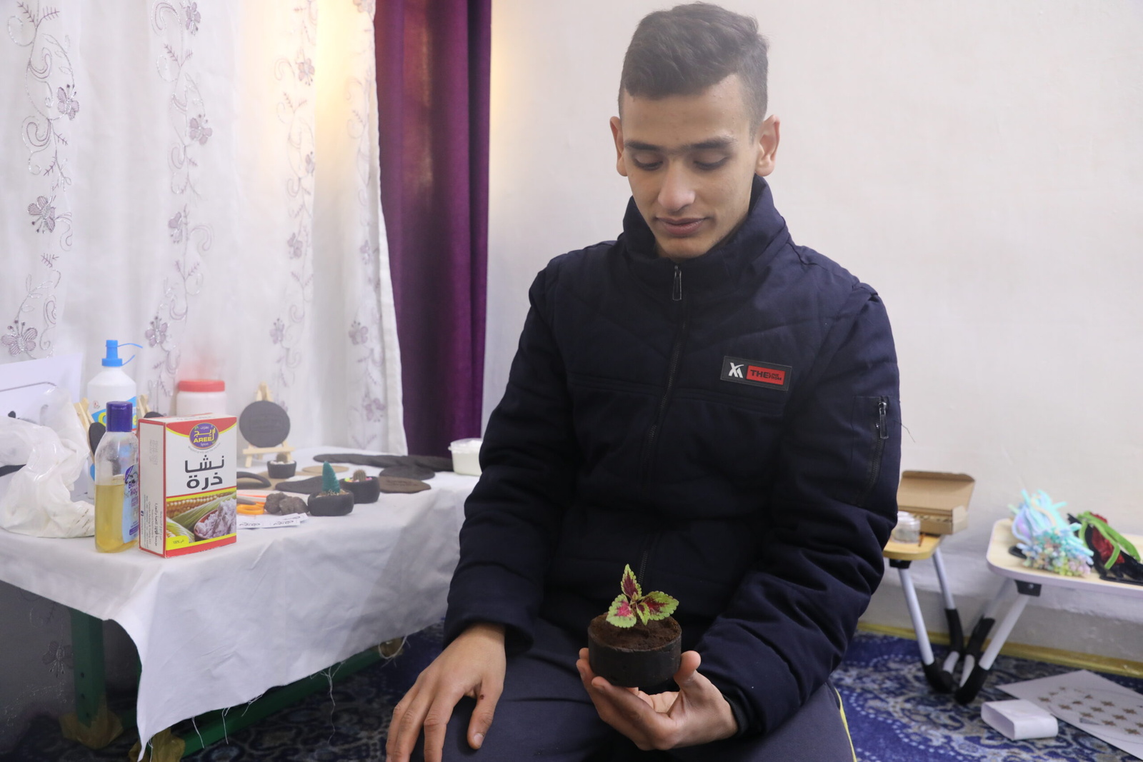 Three of their children—Hussein (16 years), Kolbahaar (20), and Maram (18)—have embraced this fresh start, each carving a path that benefits both their family and the environment. Hussein, passionate about agriculture, stumbled upon the idea of turning discarded coffee grounds into plant pots and coasters: “I always loved farming and agriculture, and wished to plant and grow my own crops, my idea started in planting mushrooms in coffee grounds, but it did not work,” he says.