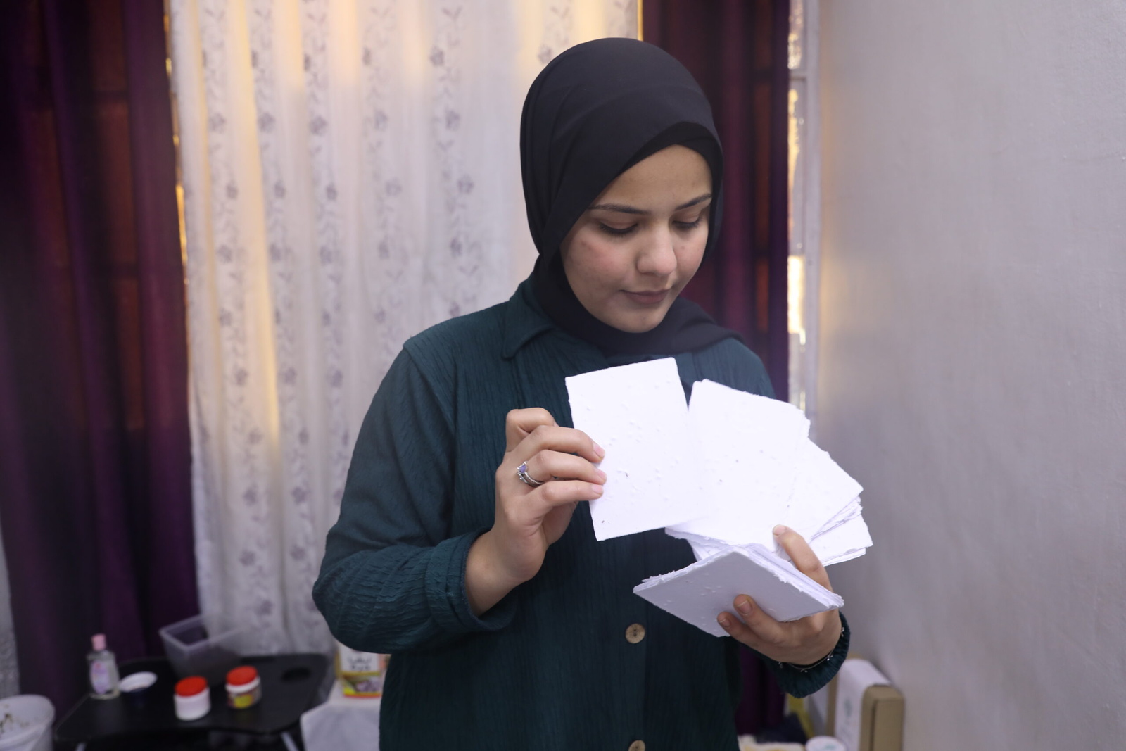 Maram Hessobaku, an 18-year-old Syrian refugee, recycles paper for a greener future, embedding seeds into her creations so they can grow into plants when planted. © UNHCR/Batool Ghaith