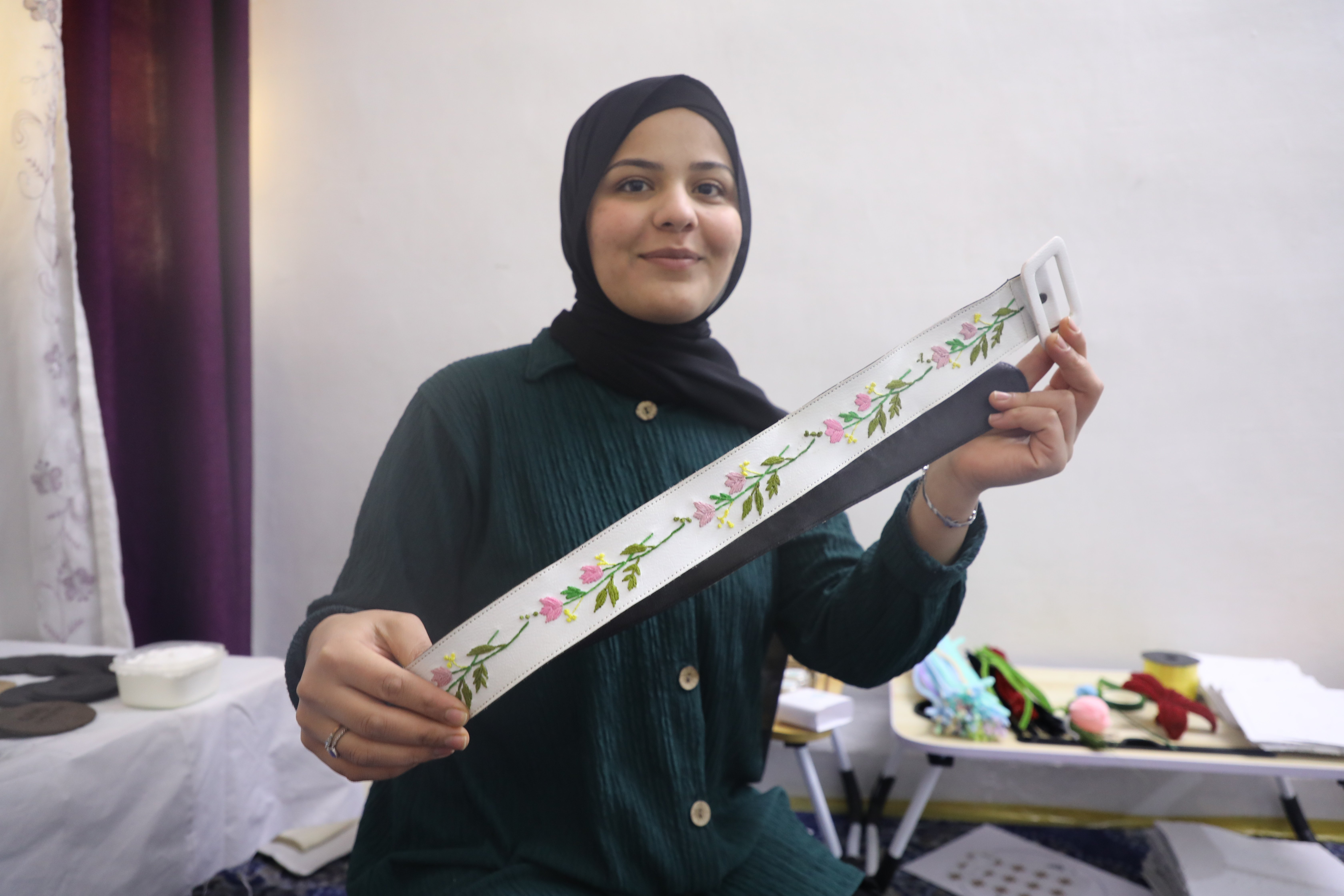Maram also upcycles old clothes into unique designs, crafting belts or jackets which blend creativity with sustainability and culture. © UNHCR/Batool Ghaith