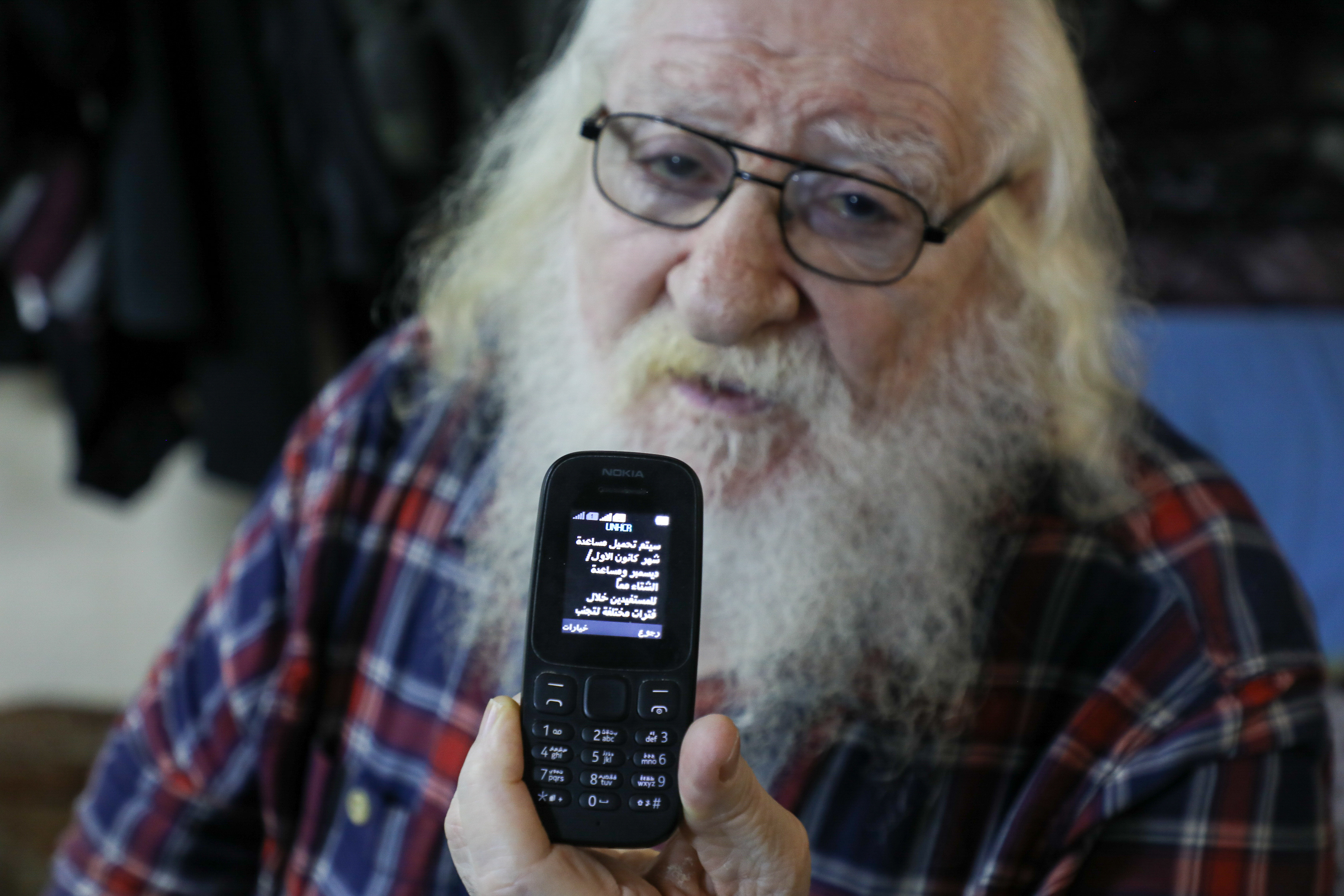 Huda\'s father, EzzEldin, 75, receives an SMS informing him that he will receive winter assistance this year