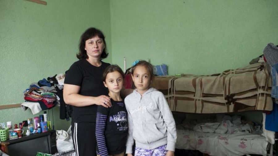 避難民が増える続けるウクライナ 越冬準備が急務 2014年10月24日 ウクライナ人の親子と娘の友達。スラビャンスクの避難施設の部屋で撮影された。施設にいる人々の多くがルハンスク州とドネツク州から避難してきている。