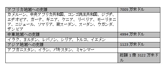 日本政府はUNHCRに対して1億3122万米ドルを補正予算からの支援として決定した。この資金は、世界26ヶ国における難民、国内避難民、帰還民、無国籍者支援に充てられる。内訳は、アフリカ(7005万米ドル)、中東(4994万米ドル)、アフガニスタンと周辺国(893万米ドル)、ミャンマーの国内避難民と無国籍者(230万米ドル)である。今回の支援はUNHCRが2015年に人道支援を展開するのに必要な68億米ドルの一部として活用される。