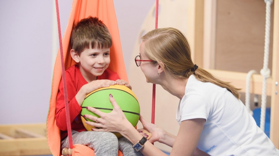 障がいのある子どものためのケアセンターで、6歳の子どもと話をする心理学者
