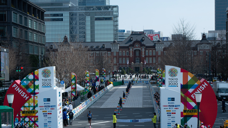 「東京マラソン2020」に出場したヨナス・キンディ選手。東京駅をバックにゴール