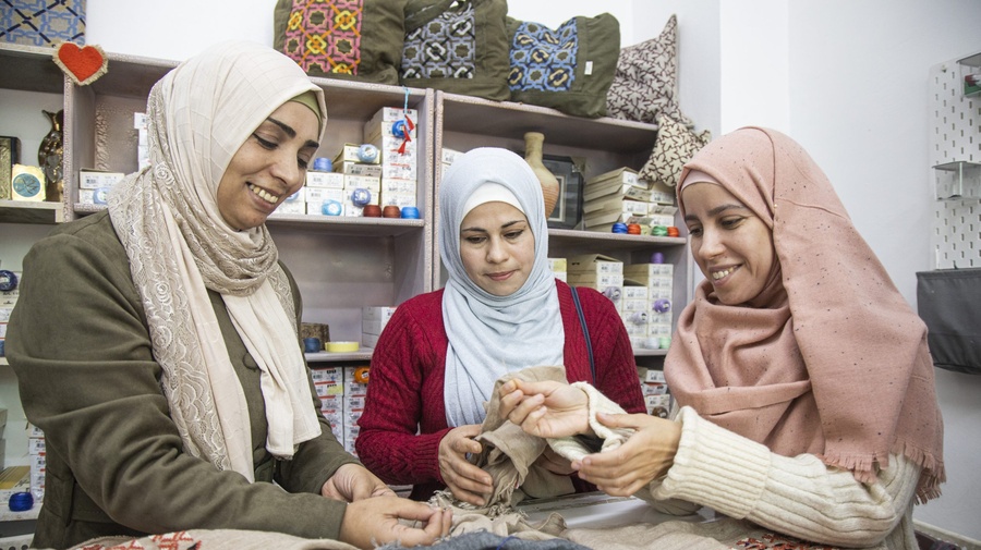 布に刺しゅうを施すシリア難民の女性グループ。将来自分の店を持つことを夢見ていたが、美術大学を卒業直後に、紛争のためヨルダンへの避難を余儀なくされたメンバーもいる