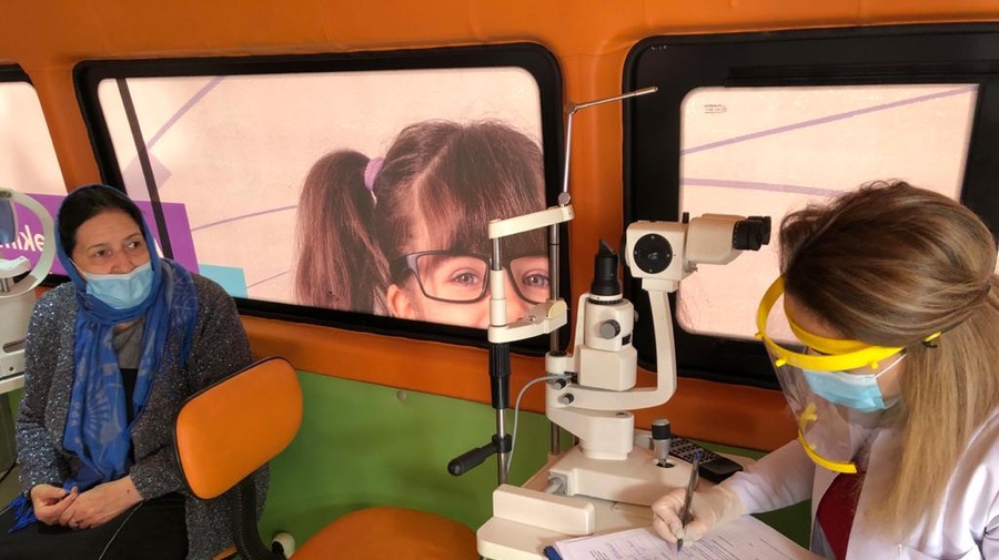 アゼルバイジャンの国内避難民に視力検査を行い、富士メガネから寄贈されたメガネが配布される