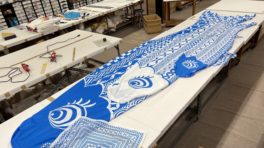 「世界難民の日こいのぼりプロジェクト」で製作された青色のこいのぼり