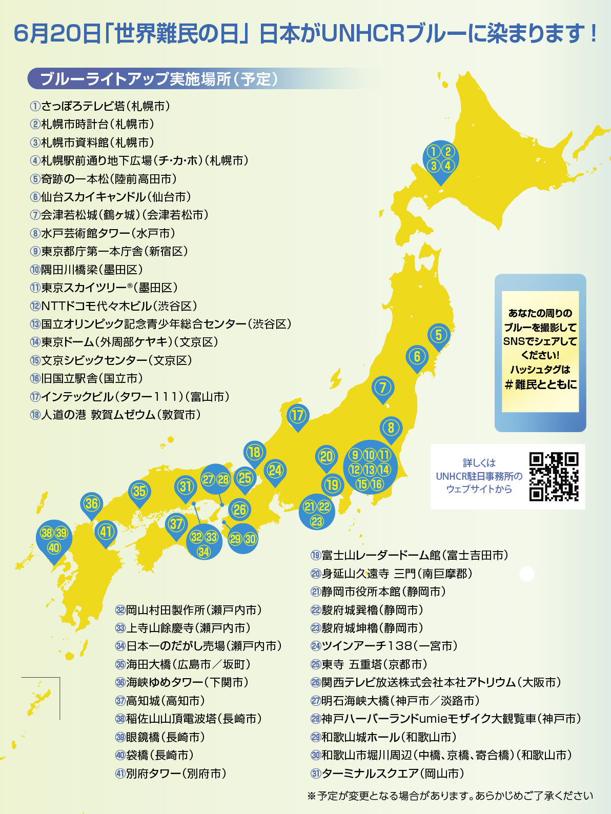 国連難民高等弁務官(UNHCR)駐日事務所は、2022年6月20日「世界難民の日」に日本各地の自治体や企業・団体の皆さまの賛同・協力を得て、全国41カ所のランドマークを UNHCRカラーのブルーに染めるライトアップを実施します。世界各地で故郷を追われた人々に想いをはせ、日本からの連帯をブルーライトアップを通じて示し、難民問題へのさらなる理解・支援を呼び掛けます。
