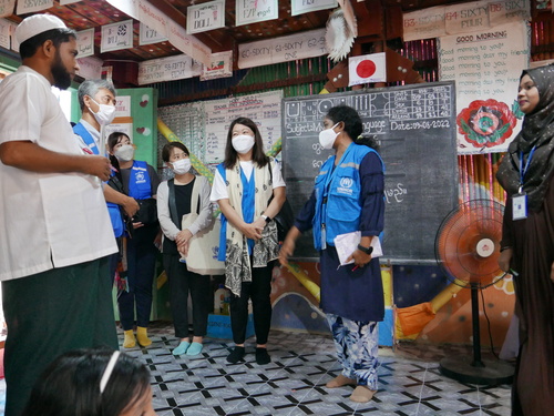 昨年キャンプ内で生まれた子どもは約3万人。避難生活が長期化する中で、故郷を知らない子どもたちも増えています。視察先のラーニングセンターでは、ロヒンギャ難民の男性たちがボランティアで子どもたちの指導を行っており、昨年12月からミャンマーのカリキュラムの採用が始まり、ミャンマー語で学ぶことができるようになったといいます。