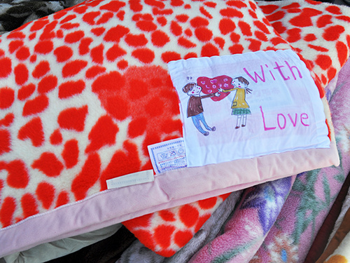 この運動の一つの特徴が、毛布にメッセージを縫い付けて届けるということです。可愛いイラスト付きのメッセージは一つひとつ異なり、まるでラブレター付きの毛布のようでとても喜ばれているそうです。